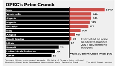 One of the big nasties from any oil price drop has to do with places that derive most or all their public revenues from the sale of oil. The budgets of countries like Venezuela or Iran are almost completely dependent on oil sales for their government revenues. Further, the price bubble since 2009 has left them dependent on a high price to cover rising public expenditures used to buy off political dissent. There are many estimates of what different oil countries need to break even, and here is one from a Wall Street Journal article. When the article you are reading was written, the price was $80 and expected to fall more.